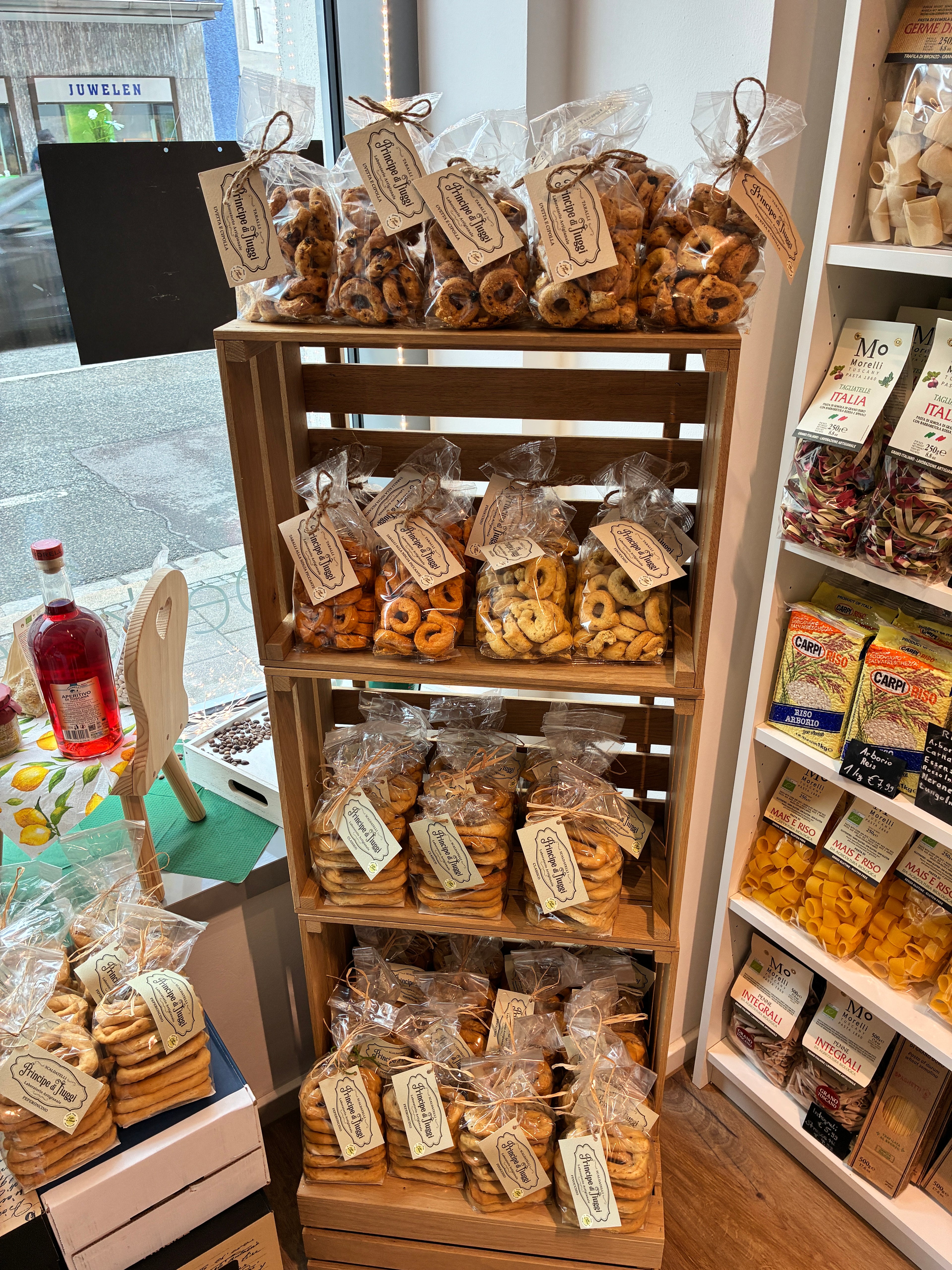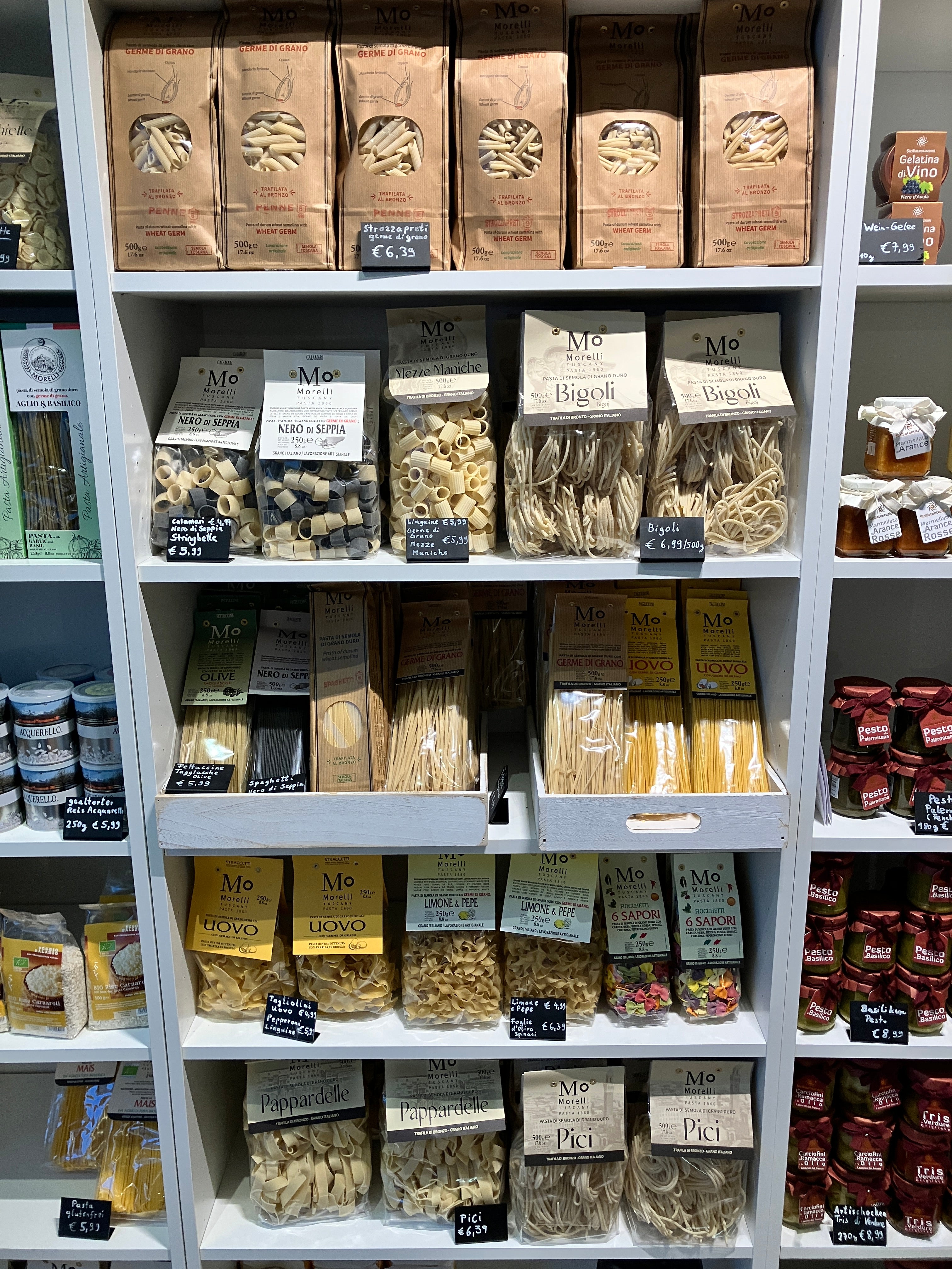 Das Angebot reicht von puristischen Varianten, wie Strozzapreti, Linguine, Paccheri über bunte Nudeln und glutenfreie Varianten aus Mais- und Reismehl bis hin zu Eiernudeln und mit Trüffeln, Oliven, Peperoni oder Steinpilzen verfeinerten Sorten.
